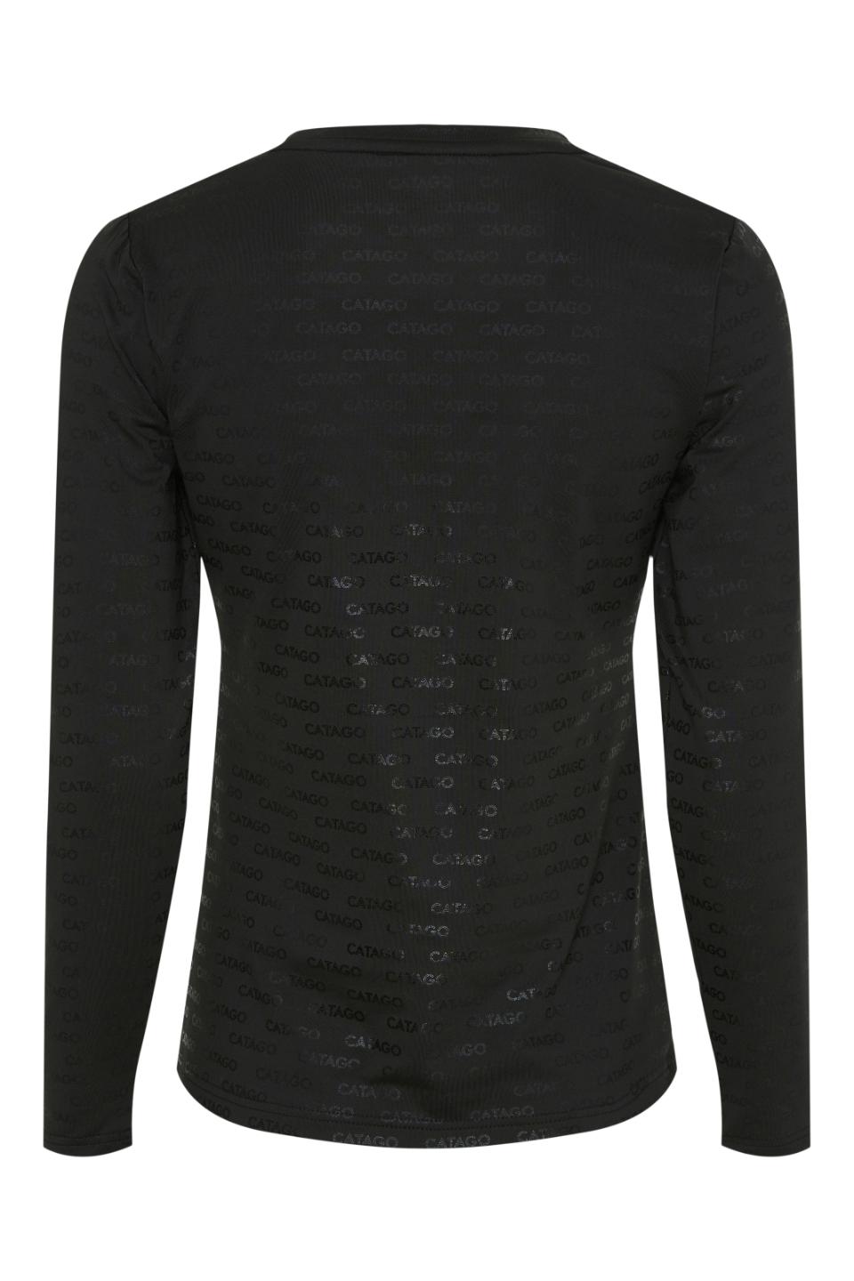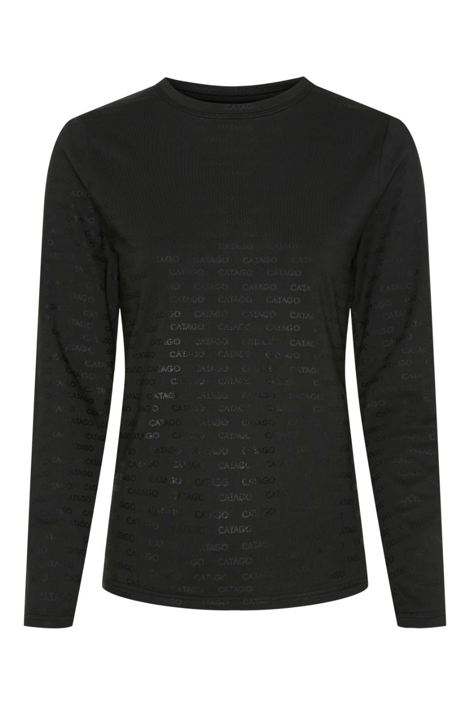 Tight-fitting long-sleeved blouse designed in a light and stretchy jersey with a brushed inside. A round neck and curved hem give this otherwise neutral shape something feminine. The black tone-on-tone, glittery logo print adds a modern and quirky dimension.