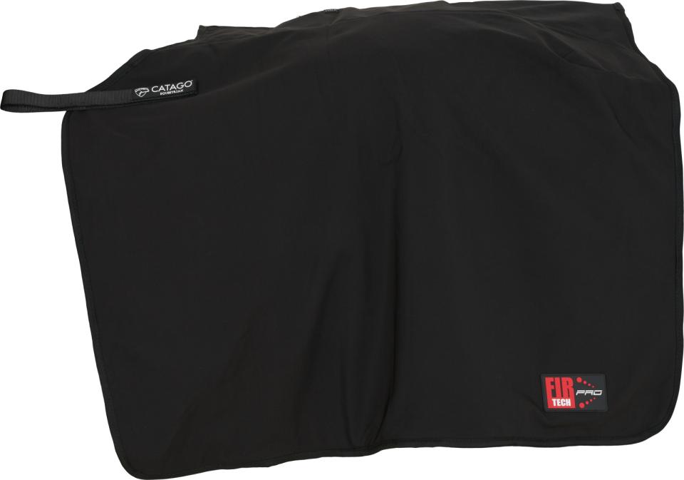 Exercise quarter rug featuring the Catago FIR-Tech PRO technology. Beneficial self-healing and relaxing effects of the active carbon fibres. Can be used before and/or after exercise. Integrated button to adjust the active long wave infrared radiation between 3 different settings, located right behind the saddle for convenient use. An ergonomically shaped cut out allows the rug to make maximum contact over the back. A long skirt ensures coverage down over the flanks and hind quarters. Two large Velcro straps position the rug securely in place. A perfect product to warm-up the all-important hind end before exercise by increasing blood flow and reducing tension. This is particularly important during the winter, for older stiff horses, or those affected by muscular disorders