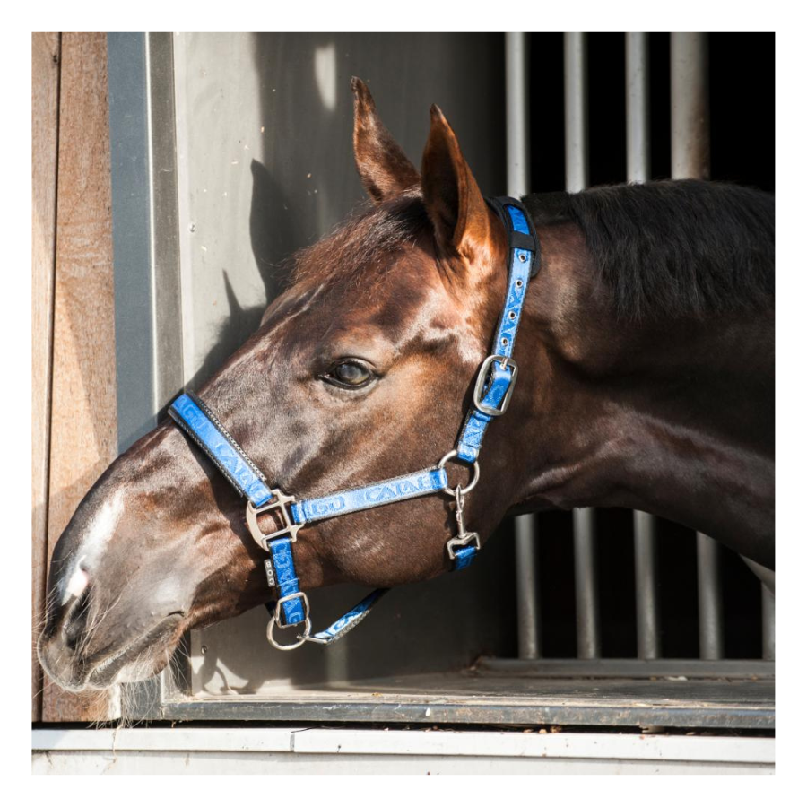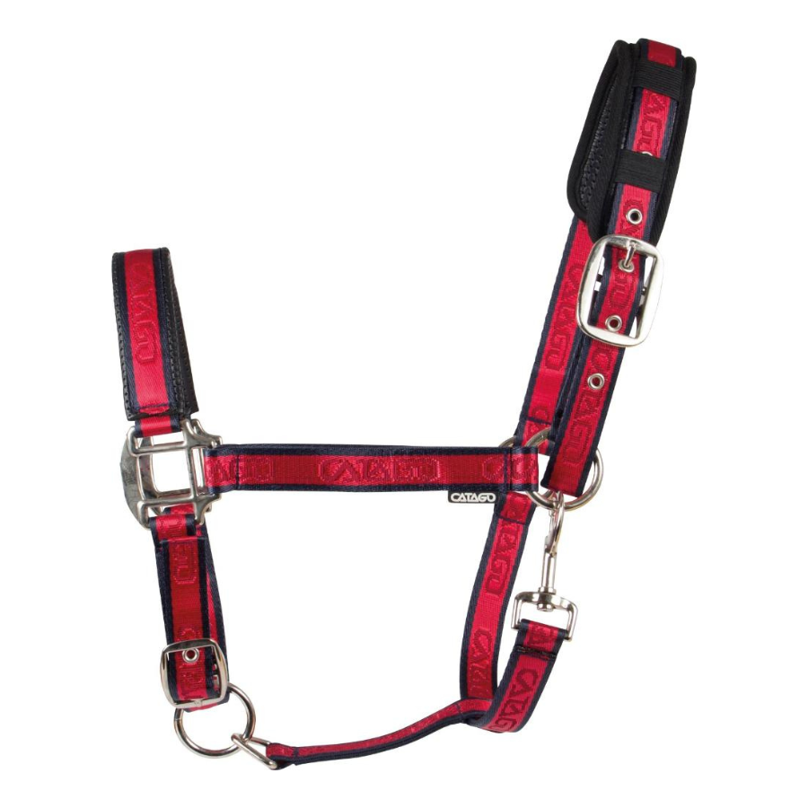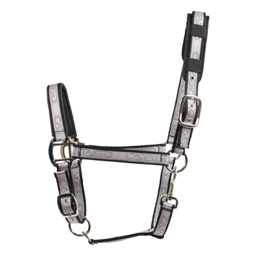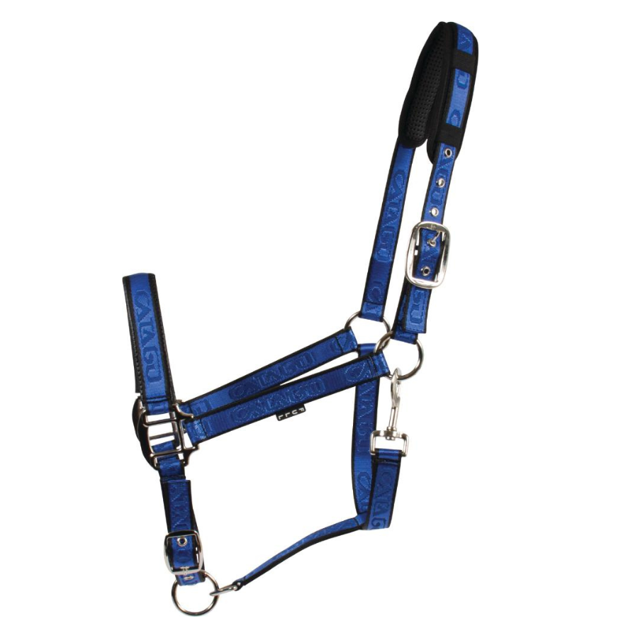 High quality soft webbed halter with woven logo effect. Perforated effect SympaTex padding creates an imitation leather-look while adding desirable cushioning. Detachable waffle Neoprene poll pad on head piece for versatile placement and cleaning options. Adjustable nose band and head piece to fit a variety of head sizes. Rich hardware