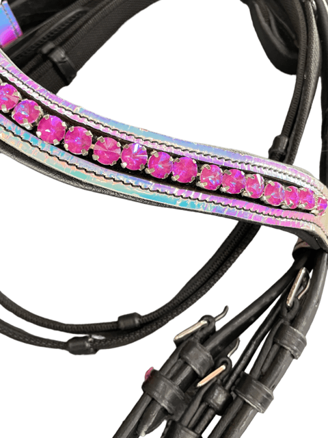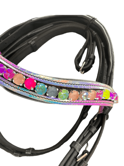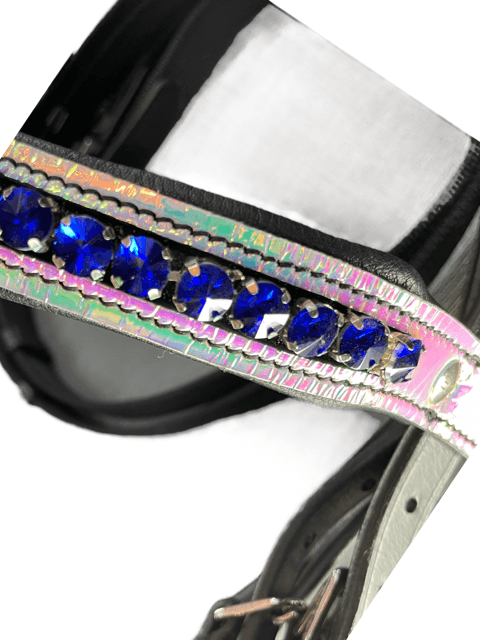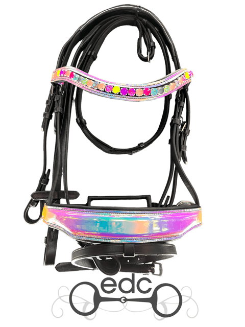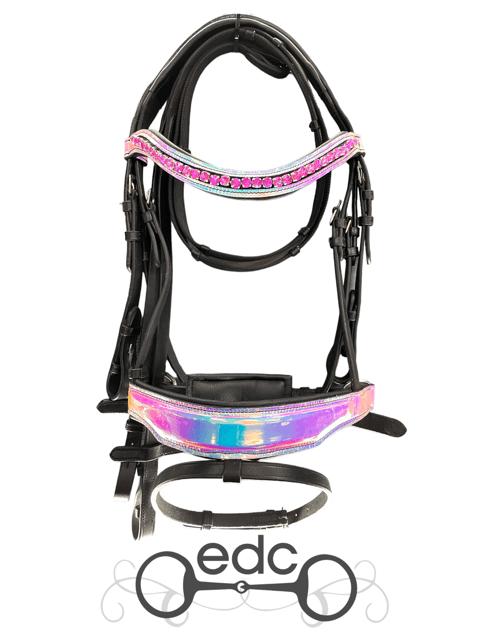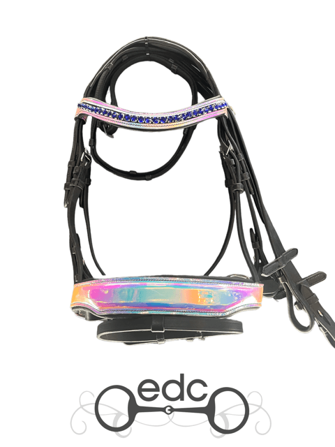 The EDC Holographic Bridle brings ALL colours together. A rainbow of happiness to frame your horses face. There is a choice of a Neon crystal Browband, all pink crystal Browband or the royal blue Browband .