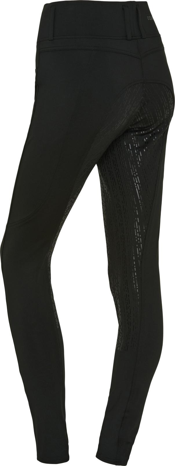 Mid rise technical riding tights with beltable waistline. Comfortable wide elastic waistband. Full seat silicone grip in a shiny tonal dot-and-dash print. Faux front pockets and invisible deep phone pocket on right outside thigh. Perfect for competition and everyday training.