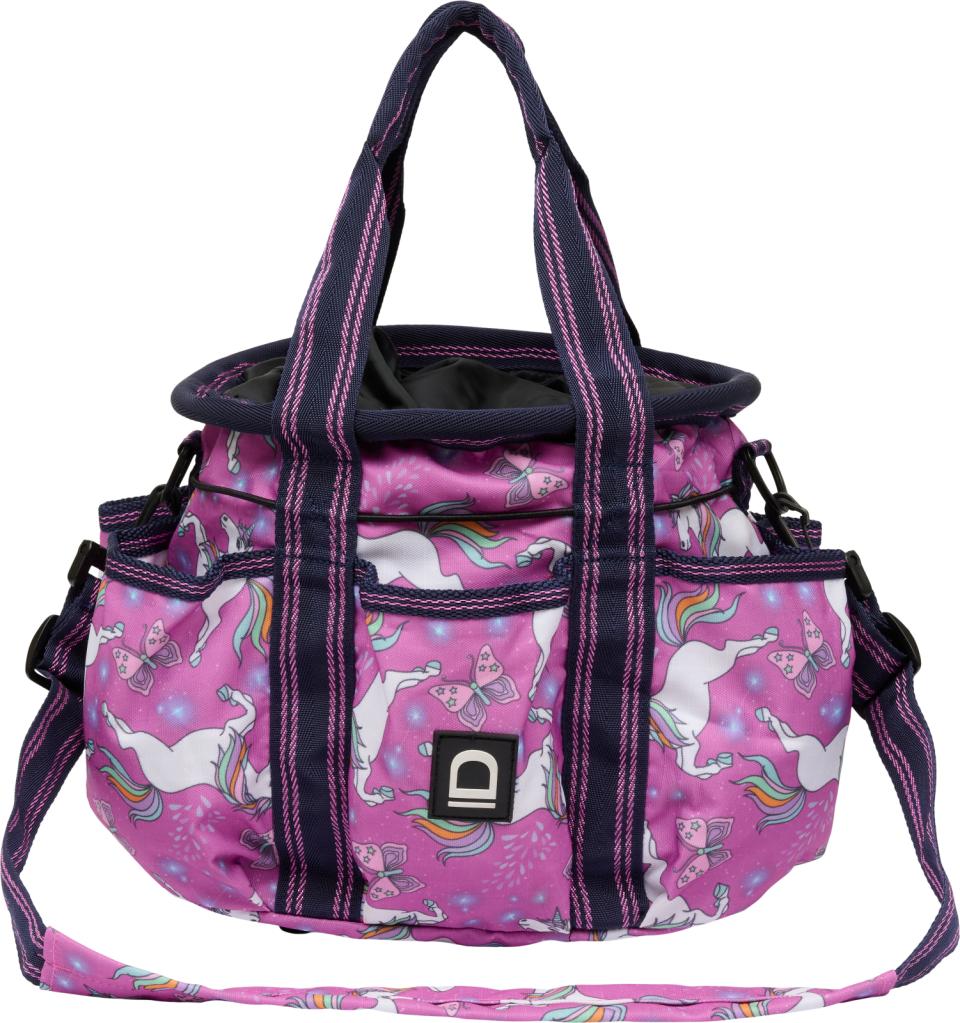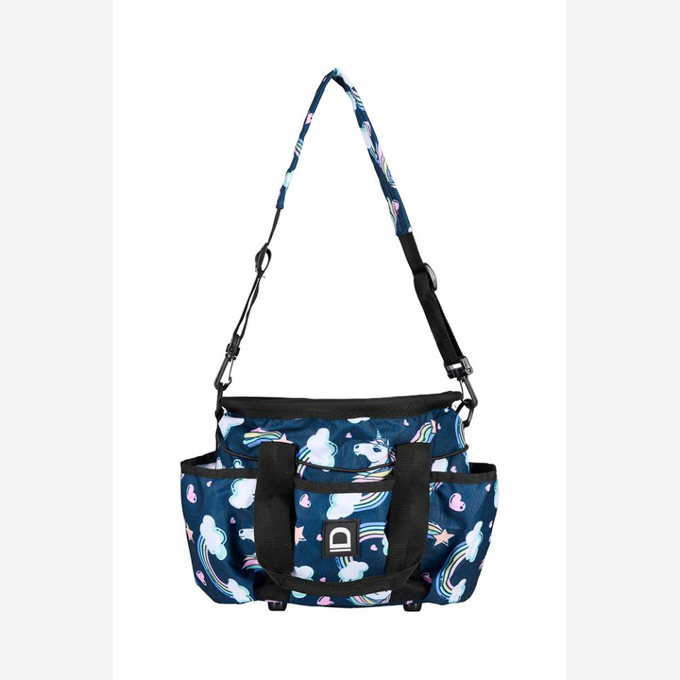 Soft round base children's grooming bag. Strong well designed model to withstand daily use and wear-and-tear. Large internal compartment and six external pockets. Top sealed via drawstring fabric hood. Webbed handles and matching adjustable padded shoulder strap. Monochrome stirrup rubber logo badge. Highly durable material with playful multicoloured unicorn design.