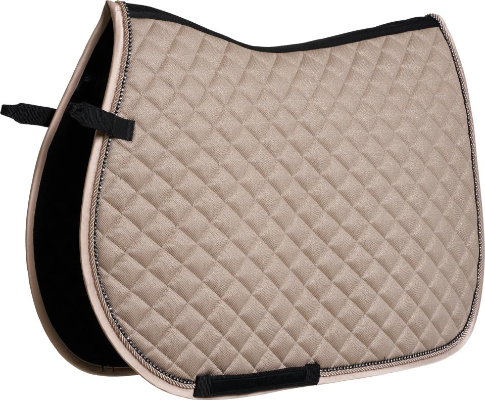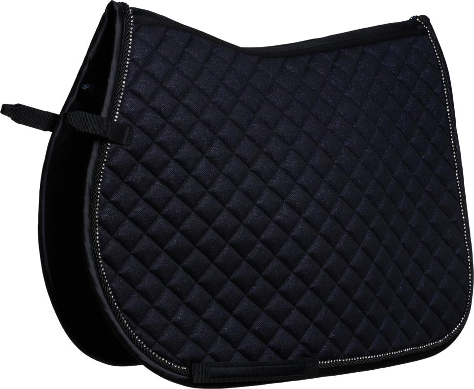 Sporty saddle pad edged with matching piping and contrasting rock crystals. Designed from a delicate mesh fabric with a beautiful glittering underlay. Light, breathable, and quick drying to prevent the accumulation of sweat. 3D mesh spine ensures the pad lies smoothly and comfortably under the saddle. Matching fly veils available.