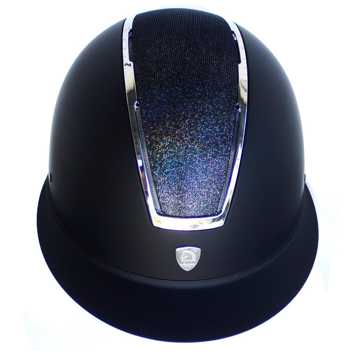 Cap with wide visor and iridescent central plate, shiny profiles, ventilated and light. Body in ABS, shock resistant, even at extreme temperatures. High density EPS shell (expanded polystyrene) with excellent shock absorption properties, which also allows excellent air circulation in combination with the front, rear and central ventilation zones. The internal padding fabric is moisture absorbing, removable and washable. Adjustment system with rear wheel mounted on a 5 position headband. Quick-release microfibre fastening straps, 4-point back fastening for neck protection, chin protection. CE VG1 Standards, TUV Certification.