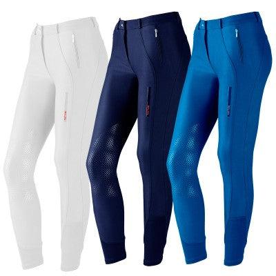 Model in light technical fabric (90% nylon, 10% spandex), soft and extra comfort, with vertical side cuts, vertical zipped pockets, shaped seat, silicone knee patches, stretch ankle insert.
